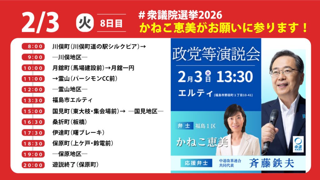 13:30より福島市のエルティにて応援弁士に斉藤鉄夫中道改革連合共同代表、枝野幸男元内閣官房長官を迎えて政党等演説会が行われます。